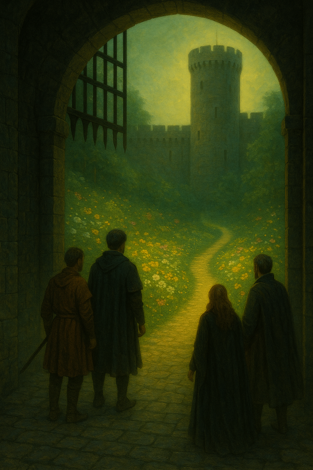 Kurz über der Tür sammelte sich das Licht, verdichtete sich zu einer gleißenden Kugel, die pulsierte, als würde sie Energie aufsaugen. Dann – ohne Vorwarnung – explodierte das Zentrum nach oben: Eine Lichtsäule in schillernden Regenbogenfarben schoss mit ohrenbetäubendem Knall gen Himmel und durchbrach das matte Firmament. Sekunden später verschwand sie spurlos in der Höhe – als hätte es sie nie gegeben.